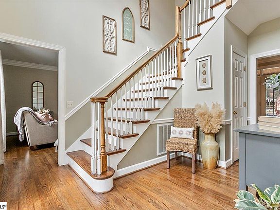 This beautiful Easley property truly offers a lifestyle as well as the perfect place to call home! Nestled on the golf course of Smithfields Country Club, the back of the home has sweeping views of several fairways which can be enjoyed from the screened porch, sunroom, or deck. While the lot feels open and expansive, it is private thanks to being located on a cul de sac and not having a another home to the right side. The stately all brick house welcomes you into a sunny, two-story entry with gorgeous hardwoods and an impressive staircase. To the right is a dining room large enough to hold all of your family and friends and to the left is the living room with a cozy fireplace and plenty of space. These rooms join the kitchen which boasts granite countertops, ample cabinets, and an island with complimentary finishes plus function. The kitchen sits perfectly between the dining room and the screened porch to entertain any size gathering. Don't miss the walk-in pantry with custom shelving and glass door! Also on the main floor is an inviting bedroom with a full bathroom and deck access, offering privacy for guests or a main floor owner's suite. And don't forget the sunroom with incredible natural light for growing happy plants or enjoying a good book. Up the stairs you will find the large owner's suite with dual closets, a dressing room (which could be a small office), and en suite bath. Plenty of options here. Two more bedrooms and a full bathroom as well as the laundry are located on the second floor. Up another short flight of stairs and you are in the huge bonus room which could easily function as a play room with separate gaming and crafting areas, a homeschool room, an office, or a hobby room - use your imagination! Other extras include a second rear staircase, a golf cart bay in garage, wide driveway for parking additional cars, tons of closets and floored attic spaces for easy storage These owners enjoyed refreshing the hardwoods throughout the living spaces, replacing stair treads, and new flooring in the owner's suite, to name a few improvements. The neighborhood lends itself to knowing your neighbors, taking advantage of club amenities, golf carting to nearby restaurants, or just enjoying carting in the evenings. Take advantage of all that Easley has to offer, including the Doodle Trail, the Silos, and the growing number of restaurants and shops...so many places to meet up with friends! In addition, this location puts you 20 minutes from downtown Greenville, 25 minutes from Clemson, 15 minutes from I-85 plus amazing lakes, waterfalls, and hiking trails throughout the Upstate. So many options to craft your lifestyle at 417 Inverness Way...welcome home!