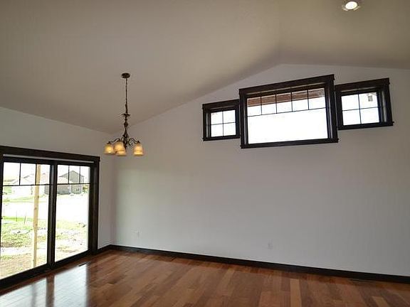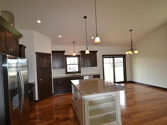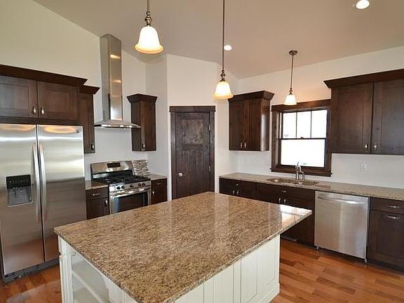 New construction, split entry home with many unique features, including: stamped and colored concrete along driveway into entry which has tongue-and-grooved ceiling offset with cedar beams and corbels; entry includes bench and storage racks; covered rear porch with tongue-and-grooved ceiling; knotty alder cabinetry; granite counter in kitchen; and many extras such as extra trim accents, box ceiling in master and dimmable rope lighting in master. Master bath has heated travertine tile flooring with tile surround and glass enclosure shower. Garage is finished and heated with water and drain. Basement can be finished for additional cost. Contact a real estate agent for more info.