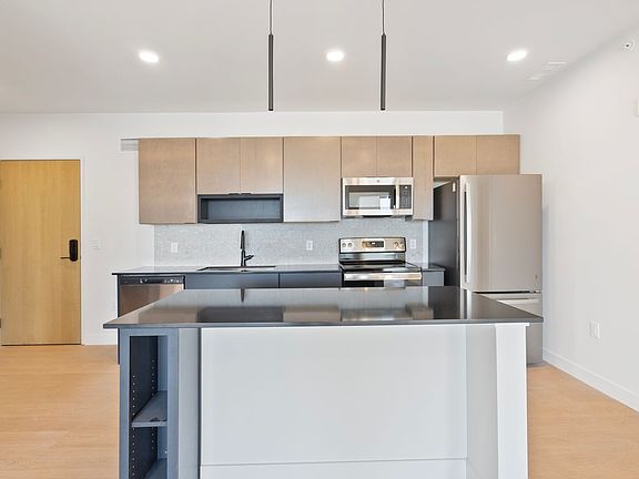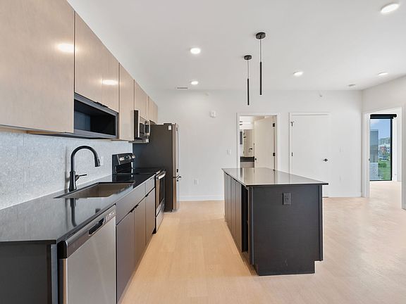 This is a 2 bedroom, 2 bathroom unit in Mackson Corners, a 4-story residential development located at 417 Marion Road in Oshkosh, WI, directly on the Fox River. The building includes 74 residential units of various sizes, including furnished and unfurnished studios, one-bedroom units, and two-bedroom units. Features like the river-facing fitness center and walk-up residential units connect the building to the surrounding neighborhood, encouraging pedestrians to flow through the site to the river. There is also ample space for gathering on site including a first-floor lounge & rooftop terrace. The building has both underground, heated parking and surface parking.