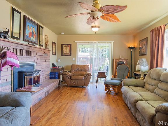 Lovely and well cared for home in desirable Kalama! Hardwood floors throughout living area and bedrooms. Large eat-in kitchen updated with newer cabinets, granite countertops, and stainless appliances. Large double-side brick fireplace in kitchen and living room w/ pellet insert on this side. 3 bedrooms, 1.5 baths inside plus detached finished building with half bath makes a great hobby or guest space! Perfect amount of acreage to garden, stretch out, but not too much to maintain! Room for SHOP!