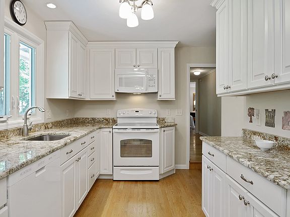 Welcome to this immaculate 3 Bedroom, 2 Bath Ranch style home, situated on a .4 acre lot. This cozy residence boasts a renovated Kitchen with custom white cabinets, granite counters, hardwood floor and GE appliances. The bright, open Living Room has a picture window and entertainment alcove. A separate wing includes a Master Bedroom with hardwood floor, a full bath and walk-in cedar closet. Two additional Bedrooms and a full Bath are located on the opposite side of the home. A generous-sized Mud Room with storage shelving leads to the backyard. Front and backyard stone patios both provide a welcome spot to relax and entertain. Other features include a two car garage, full unfinished basement and a scenic, private backyard.