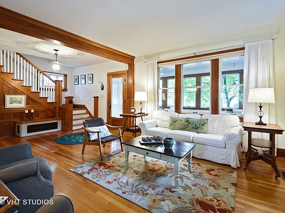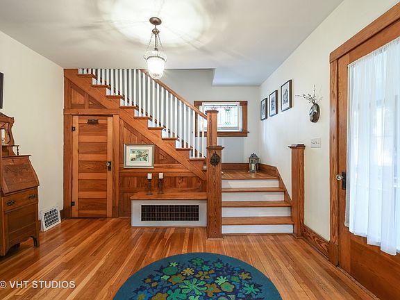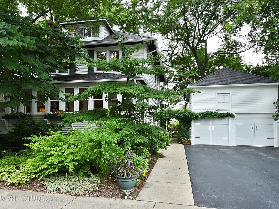 Feel instantly at home in this beautiful 1918 American 4 square on tree lined block. Original woodwork, hardwood floors throughout and high ceilings. 1st floor has heated porch which is ideal for that morning cup of coffee or snuggling up & watching a thunderstorm rolling by. The large foyer has the original built in bench, living room with decorative fireplace, formal dining room with built in cabinet, recessed cabinets and breakfast bar in the kitchen. Second floor offers 4 bedrooms and a full bath. Third floor has finished bonus room; finished basement includes bedroom, rec room, laundry room, bathroom and a storage. The 2-car garage was the original horse barn and has been completely restored to include an unfinished walk up hay loft. So many original features plus all the modern amenities you would need combined with deck and beautifully landscaped yard plus a tree fort, providing a central hub for family activities. All this plus walk to train, town, schools and restaurants