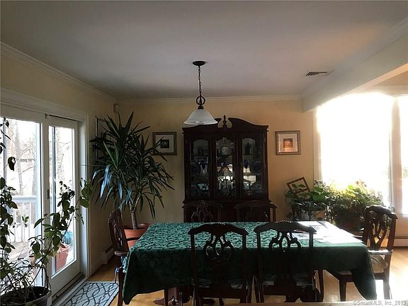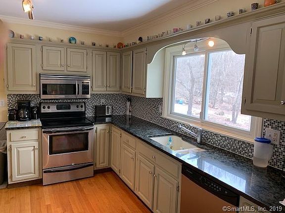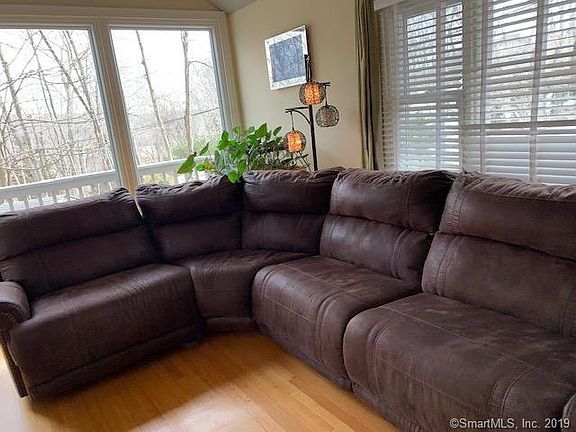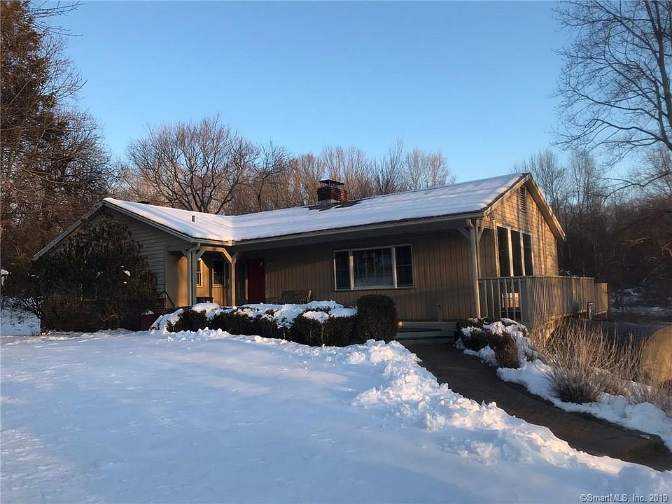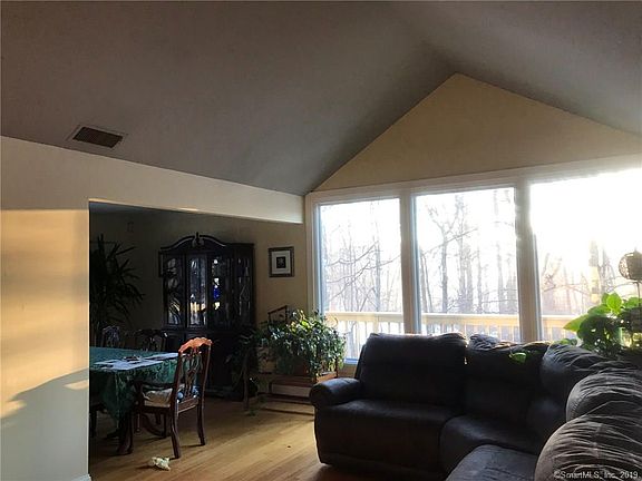 Enjoy the convenience and ease of SINGLE LEVEL LIVING, NO STAIRS, a rare commodity in this current market. Light, bright Gleaming hardwood floors, cathedral ceiling, walls of windows overlooking your beautiful back yard complete with brook, pond with fountain . You'll love the walls of windows capturing an abundance of natural light. So peaceful and tranquil yet only minutes to Interstate I-84, whether you're traveling east or west. So many special features that include hardwood floors throughout, 2 fireplaces and C/A. The living room is open and spacious with expansive cathedral ceiling and floor to ceiling windows. Main level master bedroom. Finished LL with wet bar for those looking for additional space or storage.
