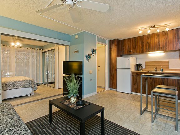 he large open floor plan allows for privacy as well with sliding doors. The open kitchen is well equipped with coffee maker, toaster, microwave, pots, pans, etc... Linens and beach towels provided. 2 blocks to central Waikiki Beach!! You can't find a better deal with a full kitchen, private lanai area, steps to the beach and pool in clean, chic, design. The open living area offers TV, free Wi-Fi, and music entertainment. All utilities and WiFi included