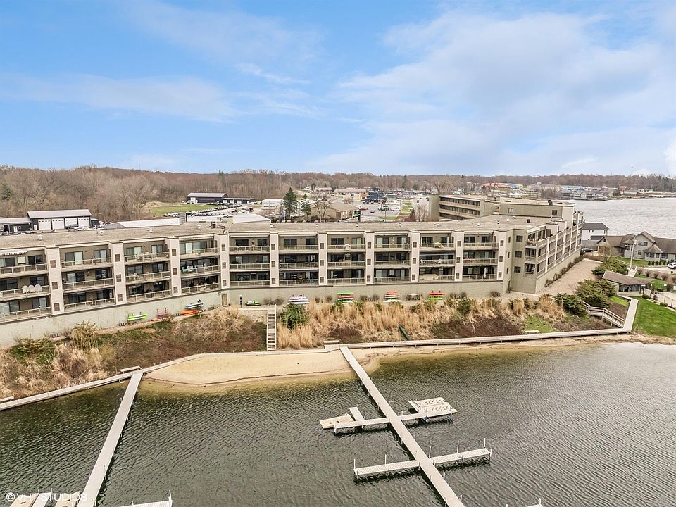 Welcome to your lakeside paradise at Outlook Cove in beautiful LaPorte, Indiana! Nestled on the shores of Pine Lake, this exquisite condo offers a breathtaking panoramic view that will capture your heart from the moment you arrive. Perched on the 4th level, this condo has been meticulously maintained and recently updated with fresh paint and new carpet throughout, ensuring a modern and inviting ambiance for you to enjoy. Step inside and be greeted by an abundance of natural light that floods the spacious living areas, creating a warm and welcoming atmosphere perfect for relaxation or entertaining guests. The highlight of this stunning residence is undoubtedly the spectacular, unobstructed view of Pine Lake that greets you, imagine waking up to the tranquil sight of the shimmering waters, or unwinding on your private balcony as you soak in the awe-inspiring sunset over the horizon equipped with a remote and wind-sensing awning. Residents enjoy a wealth of resort-style amenities designed to enhance your waterfront lifestyle. Take a refreshing dip in the sparkling pool on hot summer days, stay active and healthy in the well-equipped fitness room, or spend leisurely afternoons lounging on the beach just steps from your door. For those who love water recreation, the dockside offers endless opportunities for boating, fishing, kayaking, and more. The low-maintenance building features an elevator, the ButterflyMX intercom audio and video access control system to manage entry remotely from your smartphone, secured indoor parking with 2 side by side spaces complimented with 2 storage lockers steps to the entrance for efficient unloading, and pet friendly. Conveniently located near LaPorte's charming downtown area, you'll have easy access to a variety of dining, shopping, minutes from several golf courses; ensuring you're never far from the excitement. Don't miss your chance to experience the ultimate living at Outlook Cove before summer in this idyllic retreat on Pine Lake!
