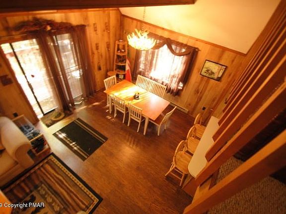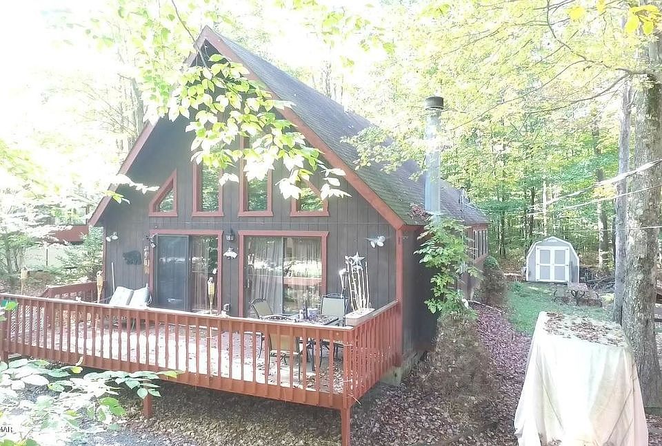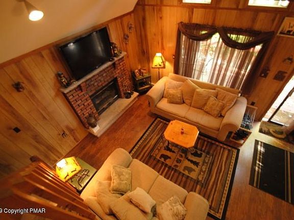 Traditional A-Frame Pocono Chalet located on a quiet cul-de-sac in the gated community of Arrowhead Lake! Oversized windows on front of the home lead to an abundance of light throughout! Main level hosts a living room with propane fireplace, dining area, kitchen, 2 bedrooms, a full bathroom, and a spacious bonus/family room addition! Upstairs is a loft overlooking the living room, a large bedroom, and a half bath. Crawlspace was completely redone with new sump pump added. This home is a must see!