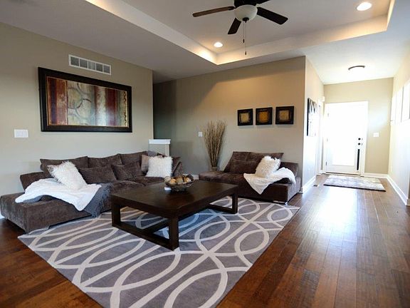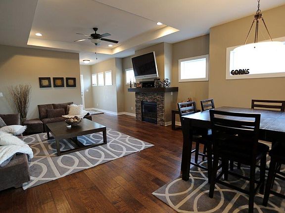 Welcome home to your contemporary custom ranch home featuring stacked stone, under cabinet lighting, travertine backsplash and hardwood floors throughout the main living area. Other great features include walk-in tiled showers with rain shower, tankless water heater, 2 x 6 construction and an additional patio recently added. Grab your bikes this summer, because this lot has direct access to the bike trail system! Bonus: This is an eco-friendly neighborhood! Water naturally drains into the run-off in the prairie grasses in-between the houses, which also adds for extra privacy. With the finished basement and over 2800 finished square feet, this home is ready for fall entertaining!