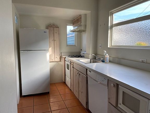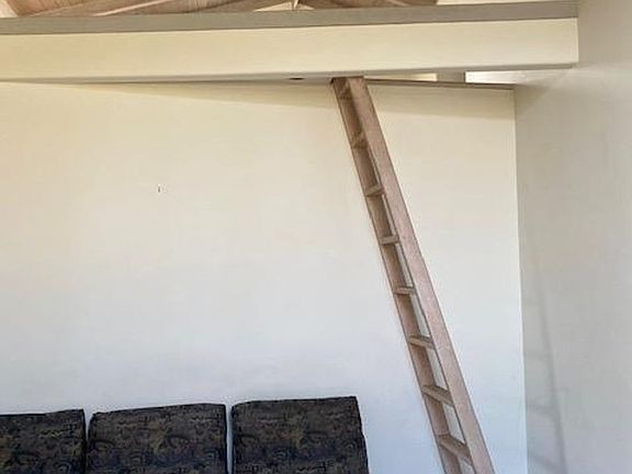 Vaulted ceilings in bed room and living room with access to a sleeping loft from the living room. Garage converted to office/workshop space.