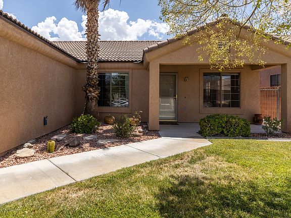 This 3-BR/2BA/2-car garage home has has mature landscaping and is located in the beautiful quiet gated community of Copper Bluffs North of I-15 that offers access to the Country Club at Mesquite Vistas and golf discounts at Oasis Golf Club. Walkway leads to a covered front porch. Front entrance opens into a remodeled great room with built in lighted media niche. There is carpet in the great room, hallway & bedrooms. Dining room was upgraded to laminate flooring and tile in kitchen and caf . Kitchen has an eat-in counter height bar, granite counter tops, stainless steel sink with brushed nickel faucet, Frigidaire Gallery refrigerator & Frigidaire dishwasher. Main bathroom commode has a bidet, walk-in shower, dual vanity & walk-in closet. Ceiling fan in great room. 3rd bedroom/den has double door entrance. Laundry room has Maytag Performa washer and dryer and cabinets for storage. Garage has shelving and side door leading to the side and backyard. Large back covered patio has outdoor ceiling fan and solar shades. Amenities include a clubhouse that offers food and beverages, gym/fitness room, swimming pool, spa/hot tub, tennis, pickleball, volleyball, basketball and horseshoe courts.