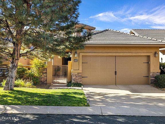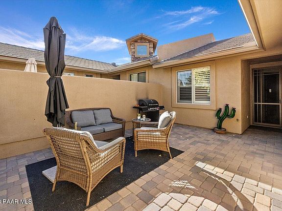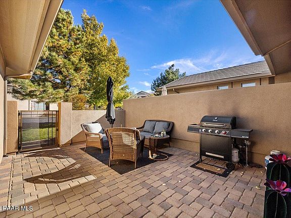 Single story townhome in Prescott Lakes' highly sought after Willow Park Estates community. Open concept living features a kitchen with tile counters & glass stacked backsplash, newer S/S appliances, 42'' maple cabinetry with upgraded hardware. Great room has tiled gas fireplace, wood shutters, ceiling fans & slider onto the back covered patio. Primary suite has a private door to the back patio, ensuite w/ double sinks, separate tub & shower (walk-in shower) & large walk-in closet! Additional bedroom/office/hobby room and 3/4 guest bath. Level entry with private gated courtyard and two car garage with built in storage. Rear yard has easy maintenance turf for your pet. Ideal for full or part-time living. Enjoy the Prescott Lakes lifestyle with a top-flight Hale Irwin Signature Golf Course