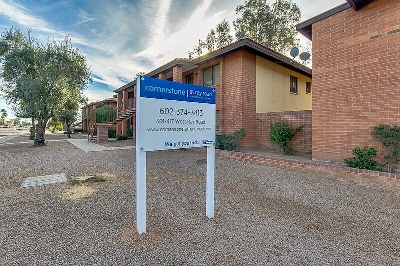 At Cornerstone at Ray Road we put you first. This spacious ground floor apartment has all the advantages. The private patio has a storage with full size washer/dryer hookups and sits right off the 16x10 eat-in kitchen making it a great place to relax. The living room is 16'5"x14 and the bedrooms are 13'x12'8 and 13'x10'4". The master bed room enjoys an "en suite" bath and walk in closet. You certainly won't feel crowded in this roomy apartment. Not all of the apartments have the same flooring, etc but all have the same lay out. Check out the website Owner pays water, sewer & trash. Resident pays electric, phone & cable