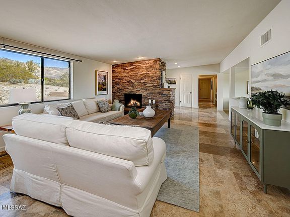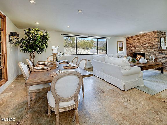 Perched on a precipice in Flecha Caida, this 1960s double-brick home is both charming and elegant. 2,040 square feet, the main residence features warm stone floors, a stacked stone fireplace, and expansive windows that perfectly frame the majestic Catalina Mountains. The formal living room flows seamlessly into the dining area, creating a warm and inviting space.A beautifully designed cook's kitchen boasts a central island, abundant storage, stainless-steel appliances, and an open connection to the comfortable family room. The primary suite offers a great retreat with an ensuite bathroom, walk-in shower, and a spacious closet and access to the backyard. Two additional bedrooms share an beautifully upgraded hall bathroom. Fresh interior paint highlights the home's bright and airy atmosphere, while modern updates include a newer septic system and a driveway with concrete pavers, providing ample off-street parking. A separate 736-square-foot guest house features a bedroom with an ensuite bathroom, offering privacy and comfort for visitors.
