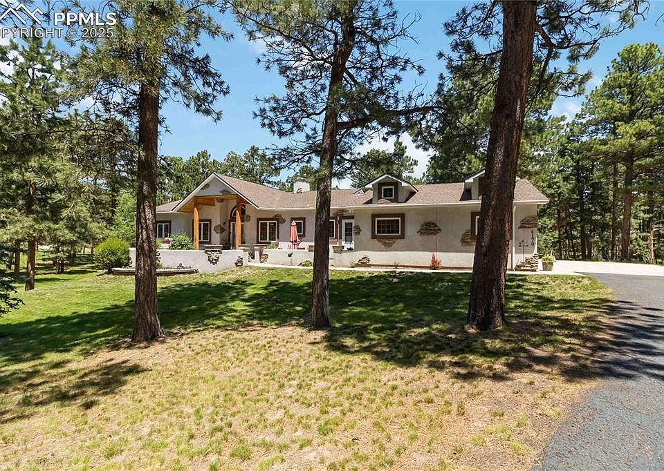 Tucked beneath the whispering pines of Black Forest, more than just a home—it’s a private retreat where elegance meets everyday comfort on 2.5 peaceful acres. From the moment you step into the front courtyard, you’ll feel it: a sense of seclusion, calm, and Colorado living at its finest. Surrounded by trees, the courtyard offers just enough privacy to unwind before you even walk inside. Vaulted ceilings and natural light greet you indoors, where a blend of hardwood and carpet creates warmth and texture throughout. A striking see-through fireplace anchors the space, connecting the living room to the heart of the home—the kitchen. Designed with both style and function, this space features a gas stove, large island, eat-in bar, walk-in pantry, and granite tile countertops that tie it all together. Just outside, the elevated deck with soaring wood-paneled ceilings feels like your own treehouse in the forest—perfect for coffee, happy hour, or peaceful evenings. The main-floor study features custom built-ins, creating a polished and private space for work or quiet focus. A large laundry room adds convenience, while the oversized three-car garage gives you plenty of room for vehicles, storage, and gear. The home also includes a full alarm system for added peace of mind. The primary suite brings luxury and comfort together with its own fireplace, direct deck access, a five-piece bath, dual vanities, soaking tub, and a walk-in shower built for relaxation. Downstairs, the finished walk-out basement expands the living space with a family room, fireplace, and a wet bar—ready for movie nights or hosting friends. Three additional bedrooms include two with a shared Jack & Jill bath and a third with its own private ensuite. Located in sought-after District 38, minutes from Black Forest trails, parks, and local favorites like R & R Coffee, this home blends privacy, comfort, and connection.