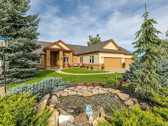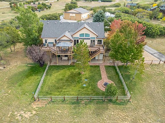 SOLD! Nestled in the trees, this incredibly well maintained, custom walk-out ranch with stunning vistas is perfectly sited on 6 acres in Christy Ridge. On paper it's 4 beds and 4 baths, spread out over 3800sf, with a 4-car attached garage, a 1600sf shop, and views. But the intangibles make it SO MUCH MORE than that. To be appreciated it really needs to be seen in person. In fact, it offers more to a new owner than can possibly be listed here. As you pull up the drive let the world and its cares melt away. Relax and enjoy the serenity of country living knowing you are city close if needed - it's minutes to Sedalia and Castle Rock, all on paved roads. Enter the home and your eye is drawn to the handsome slate fireplace, vaulted ceilings and the incredible views. As you are drawn further in you’ll appreciate the openness and light from abundant windows. The main floor has an easy flow from living to dining to kitchen, with the owner’s suite and guest bedroom at opposite ends. The kitchen showcases gorgeous granite with rich graining, plenty of cabinets, a pantry, and eat-in area overlooking the deck. The generously sized owner’s suite is a welcome retreat at day’s end and features a 5pc bath and walk-in closet with organizer. Downstairs, the finished walkout is expansive. It showcases a wide-open great room with wet bar and can easily serve many functions – games, TV, exercise, etc. It also features two guest bedrooms and bath. And if that’s not enough, take the party outside to the huge deck or patio below. Entertain friends and family on either while taking in fresh air, views, wildlife, sunsets and stars. Still not enough? Check out the 4-car attached garage or the detached 40 x 40 RV/Boat/Toy shop. This IS NOT your typical metal building. Custom built to match the home's exterior it complements the property nicely. It’s heated, has 220/120, 4 garage doors (2 are 12 x 12). Tons of parking, RV hookup. No HOA, and FREE HIGHSPEED INTERNET!