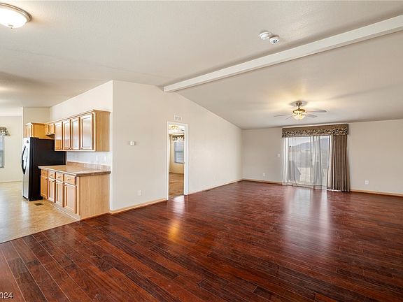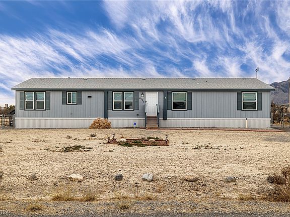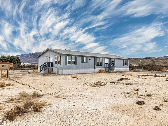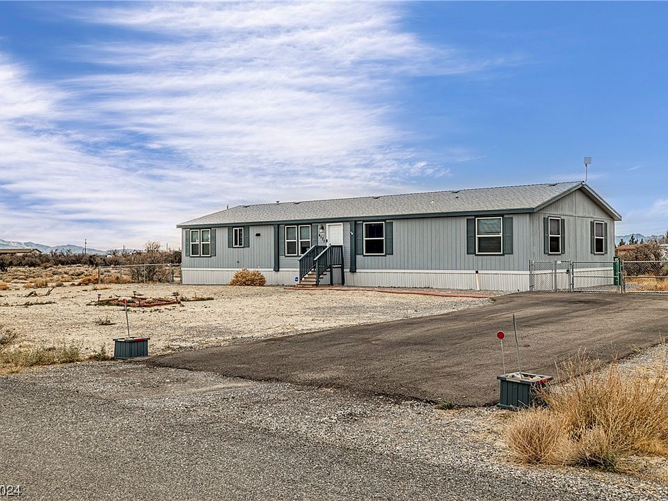 Charming 5-bed, 2-bath manufactured home in Pahrump, NV, on nearly an acre of fenced land. Enjoy RV hookups with 30 amp service and a paved driveway. The home features a spacious kitchen, separate laundry, and a stylish living room with vinyl plank flooring. The primary bedroom offers a walk-in closet, and the primary bathroom includes double sinks, a garden tub, and a shower. Security is top-notch with an upgraded system and a Ring doorbell. Additional perks: water softener, filtration system, and stunning mountain views. Private well, septic system, no HOA. Conveniently close to BLM and the main highway for commuters.