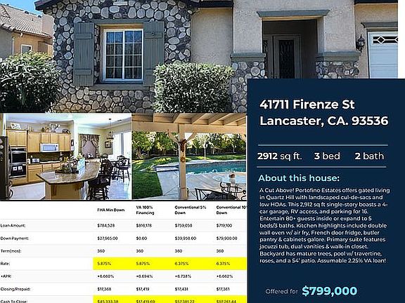 A Cut Above! Make Portofino Estates your next home. This upscale gated community in Quartz Hill features winding streets, landscaped cul-de-sacs and Mediterranean style entries. Lower HOA’s than most and fantastic board members to boot. A 4 car garage and 2912 square feet on a single story is a dream come true for entertainers and shop enthusiasts. Host a party for 80 plus guests indoors. Need more than 3 bedrooms and 2 baths, easily convert to 5 bedrooms and 3 baths with expansion planned into this floor plan. Parking for 16 cars on the driveway and RV access area. Front yard xeriscape saves on water and maintenance. The kitchen features a newer double wall oven with air fry and convection, a French door frig, cabinets galore and a butler pantry. The primary suite has a jacuzzi tub, his and hers vanities and an ample walk-in closet. Neutral marble floors throughout add elegance that coordinates easily with any color scheme and style. The indoor laundry features cabinets and an extra storage shelf. This house has cabinets galore! Enjoy your morning coffee in the park like back yard, host to mature evergreen camphor and magnolia trees. No backyard homes to worry about. Roses burst into color every spring and bloom all summer long into the fall. The pool is updated with travertine coping and azure blue tile. The plaster is only 5 years old. BBQ anyone? The 54’ patio has room for seating and a pizza oven if you wish. Plenty of room for multi generational living. Existing $265,000 at 2.25% VA loan is assumable with your VA substitution. This home is For Sale by Owner call Diane for your best deal. Buyer agents welcome.