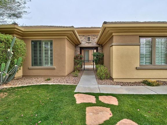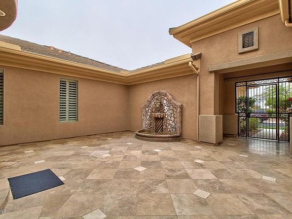 Owner is relocating. Luxury at its finest! This highly upgraded Hampton model is beautiful and spacious. It has many unique, features that set it apart from all others on market. Just painted inside and out March 2015. Beginning right when you approach the gated, 21 inch travertine tiled courtyard.With Canterra stone water features both front and backyard. Inside find crown molding thru out. Highly upgraded carpet. Den with custom built in office cabinets. Floor to ceiling master closet cabinets. The spacious kitchen includes professional stainless steel built in appliances. Gorgeous glass tiled backsplash, granite counter tops, raised panel cabinets and walk in butler''s pantry all add to the beauty. Rain gutters are 360 degrees around home. N/S exposure with large stone tiled patio.