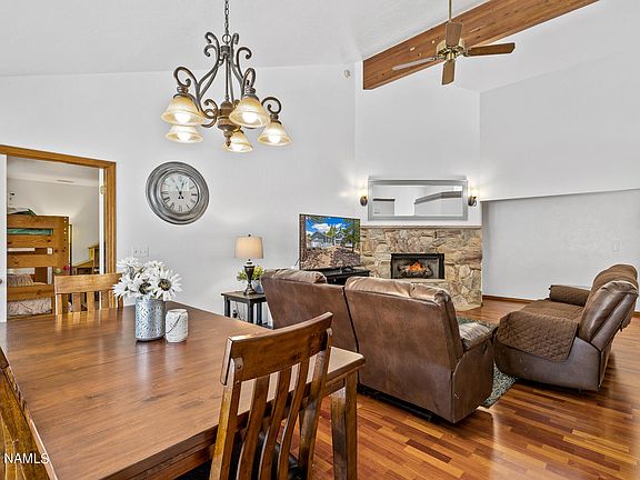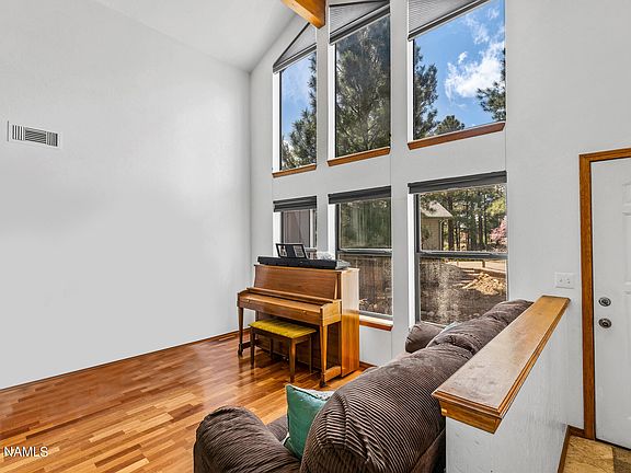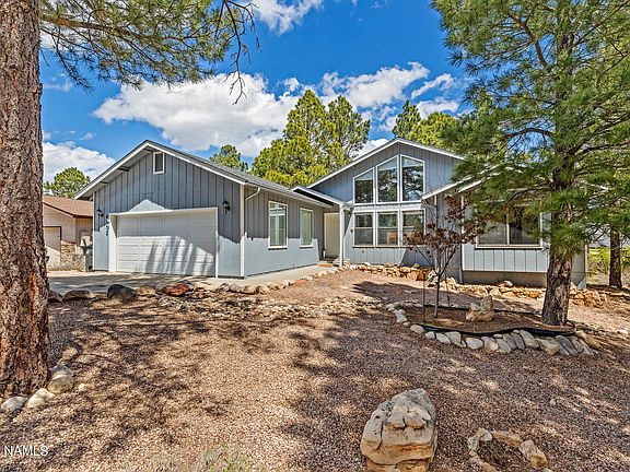 Welcome home to this air conditioned 4 bedroom, 2 bath single level property in Elk Run! Nestled in the pines on a quiet cul-de-sac, this home boasts beautiful hardwood floors, vaulted ceilings w/large wooden beams and a gas fireplace with stone hearth. Kitchen features gas cook-top, plenty of cabinet and counter space! The large master bedroom has window seating/storage and 2 primary closets, while the master bath includes a walk-in shower, double sinks and a linen closet. This home is also set up for enjoying the outdoors with a large wooden deck that is easily accessible from the kitchen and dining areas through upgraded French doors. Close proximity to downtown, NAU, and continental country club and golf course.