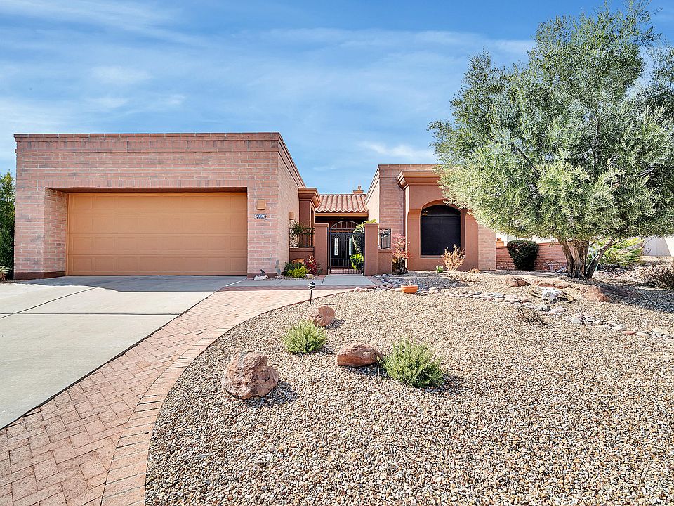 On the Golf Course signature fairway. Charming southwest style greets you at the gated courtyard & waterfall feature and through the double doors. Once inside experience the full open concept design of Fairfield canada modified floorplan, no dividing walls. A vaulted ceiling and double-facing gas log fireplace to create the ambiance you desire. Play the music and gaze upon magnificent sunsets over the ponds, your endless view to the horizon. Master suite features your private space/hideaway with walk-out patio doors. Recent upgrades, new Roof/10 Yr War, Trane HVAC, Liv Rm windows & doors, Appliances, Kitchen granite, custom Murphy bed/desk, a freshly painted exterior and more. O/A
