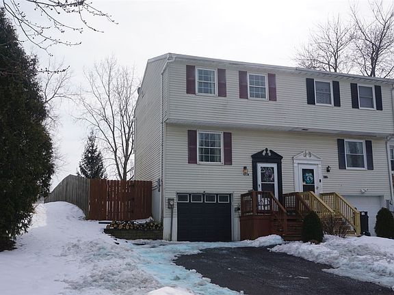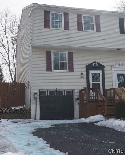Welcome to easy townhouse living! This end unit townhome offers an eat-in kitchen with painted cabinets with newer pulls and a pantry, large living room and half bath on the main level. Upstairs you will find 3 spacious bedrooms all with nice closet space, and a remodeled full bathroom. The basement has quaint office nook, mechanicals and washer/dryer which are included. Walk directly through to the extra long garage for additional storage along with parking one car! The private driveway is double wide. Enjoy the exceptionally large private fully fenced backyard with nice deck, fire pit and shed. New gutters. Fabulous location close to Liverpool schools, Routes 31 and 57 shopping and restaurants and Route 481. Offer deadline is 5pm, Sunday, 2/20/22.