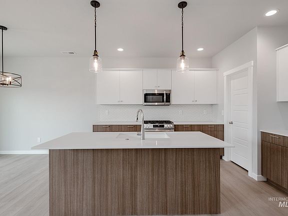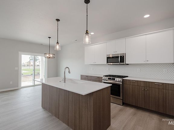 Feel enriched in your brand new home located in Meridian, Idaho! The Hugo 1650 is endearingly charming and reassuringly practical. The main level welcomes occupants and guests alike with open and friendly living spaces. The kitchen boasts upgraded finishes, including stainless steel appliances, a gas range, and stylish solid surface countertops. Easy access to the yard is just right outside of the dining room. Head upstairs where a primary suite spans the entire rear of the home and contains a walk-in closet and spacious en suite bathroom. The two other bedrooms and the laundry room are also situated upstairs along with a full bathroom. The garage offers plenty of space to park cars and toys or use as storage. A versatile layout provides endless possibilities for customizing the home to suit your needs. You'll quickly feel right at home. Photos are of the actual home!