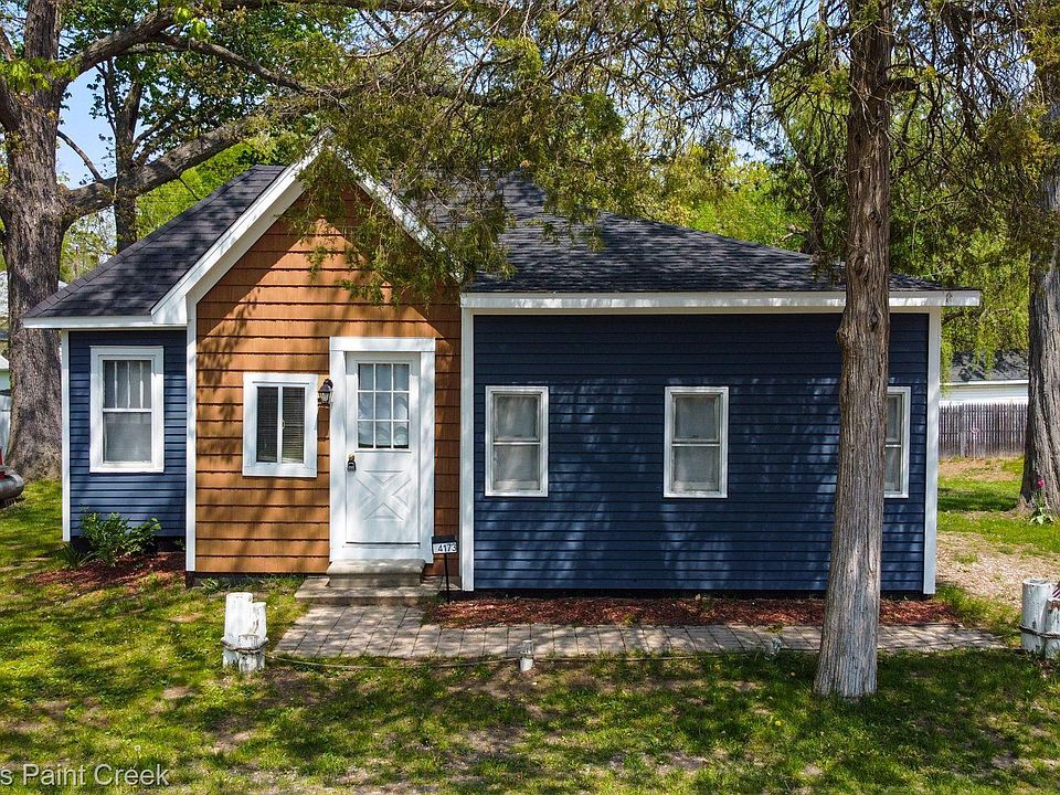 Land is owned, not leased. Welcome to this Charming 2-Bedroom Ranch-Style Home with an exquisite exterior! This property lies in its expansive backyard and the incredible all-sports lake access. With direct access to the lake, you'll have endless opportunities for swimming, boating, fishing, private beach area, and creating lasting memories with family and friends. Home has numerous updates including a complete tear off of roof in 2022, roof was reframed to raise ceilings in home for a more spacious feel.  Exterior painted with a charming blue, and complementary new siding in front! There is new luxury vinyl plank flooring in the front bedroom, new light fixtures throughout the home, old outlets replaced, fresh paint in several rooms, and more!  Come see for yourself this one-of-a-kind home! Home appraised for $142k this June. Land contract terms negotiable. **Agent owned