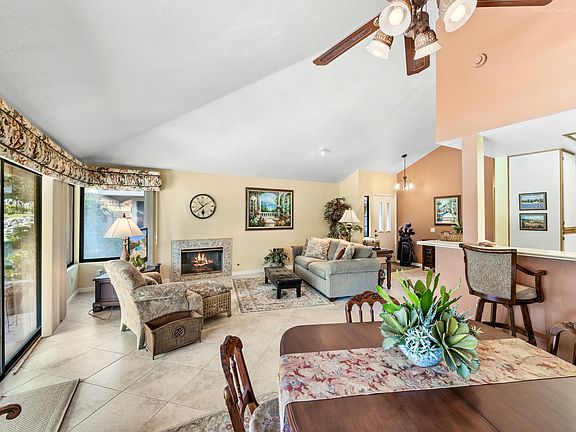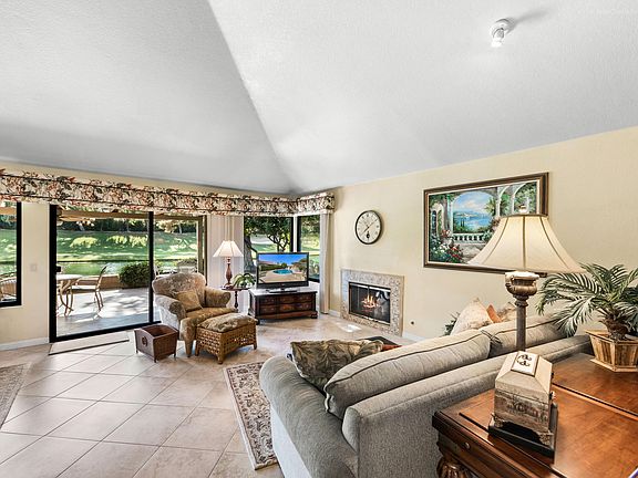 Beautiful lake, waterfall and golf course views from the tiled, covered patio of this lovely, end unit, Woodhaven Country Club condominium. You'll enjoy entertaining on the covered patio, listening to the sounds of the waterfall and cooking on the built-in BBQ. The Oakmont floor plan offers two bedrooms and two baths. The mirrored, great room (open floor plan) looks out onto the lake and golf course. Updated, tiled fireplace surround. Newer tile throughout (including patio), bedrooms are carpeted. Kitchen is open onto the dining area and great room. Kitchen features breakfast bar, lots of cupboard space and gas stove. Master bedroom and both baths are good sized. Huge, walk-in closet is finished with organizers. Stacked washer/dryer in laundry closet. Two car garage with cabinets and a new garage door opener, installed 07/21. Offered tastefully, turnkey furnished (per inventory). Woodhaven CC is an Equity owned club, 18 hole golf course, tennis courts, pickle ball, exercise room, lovely clubhouse, restaurant and lounge. One of the development's four pools/spas is very close by.