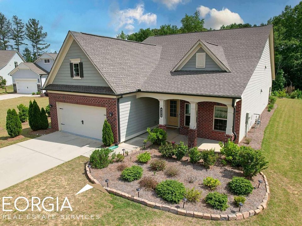 Welcome to 4175 Jayla, a stunning and contemporary home located in the desirable Manor at Woodward Preserve. This beautiful residence offers modern touches and hardwood floors throughout, creating an atmosphere of timeless elegance. Nestled in a tranquil cul-de-sac, this home welcomes you with its charming stone accents and spacious porch, exuding curb appeal. Step inside and be captivated by the bright and open living space, showcasing an inviting kitchen with an extra-large island, granite counters, stainless steel appliances, and stylish white cabinets. The flowing layout seamlessly connects the living room to the dining area, drenching the space in natural light. Retreat to the private primary bedroom, featuring a tray ceiling, en-suite bath with dual granite counter vanities, a soaking tub, and a glassed-in shower. A second bedroom offers privacy, accompanied by a full bath and a conveniently located laundry room. The backyard oasis beckons for relaxation and entertainment, featuring a covered patio, fenced yard, and serene wooded views. Additional highlights include an extended garage, a mud room with built-in organization, keyless front door entry, and comfort height toilets in both baths. Don't miss the opportunity to make 4175 Jayla your new home, where contemporary design and serene living converge effortlessly. Schedule a showing today and experience the epitome of modern elegance!