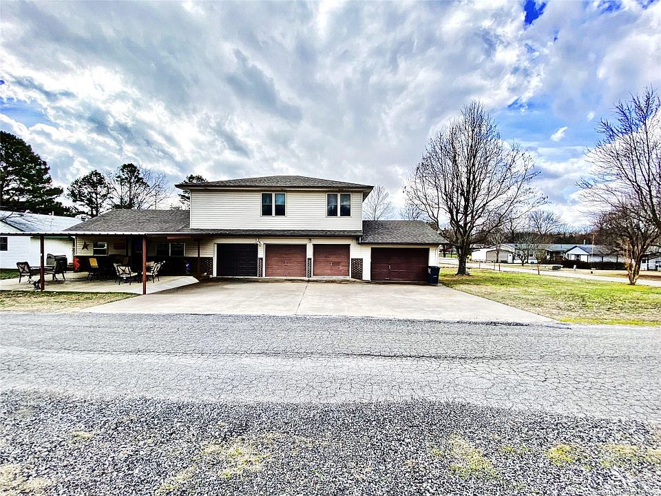 Lake retreat at it's best! This 3bd 2ba home has everything you need for lake enjoyment. Lower level has living room, kitchen, dining and full bathroom. Upstairs has 3bd with 1 full bathroom. 3rd bedroom could be utilized as a 2nd living area/game room. But wait there is a 4 car garage with lots of work space, electric doors as well as an indoor storm shelter. This community offers a boat ramp, sandy beaches, a park for the kids, picnic area, tennis courts and club room. The only thing needed is YOU!!