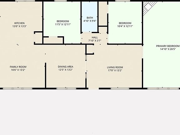 Level propertyOpen concept floor planFront wooden deckHuge master bedroomEntirely in grassLarge roomsWalk-through closet
