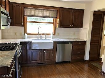 beautiful newer granite countertop and backsplash and a farmhouse sink. The expansive dining area is