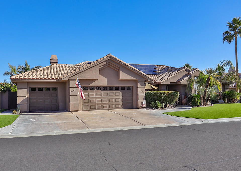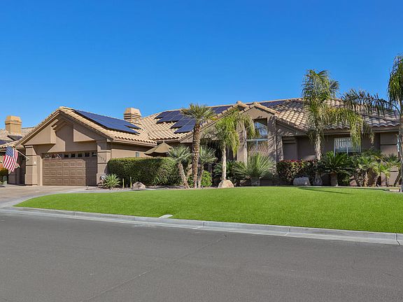 Stunning home located in the upscale gated community of Sunterrace. The architectural design is impressive & the curb appeal set the scene for this home. Whatever your style is, the large size of this floorplan can offer endless possibilities and accommodate a large number of guests for a gathering. Step inside and be greeted with formal living & defined dining areas. Both areas have french doors which bring the outside in. The kitchen and family room are on one wing of the house. This space also includes a wet bar and breakfast area. Two additional sets of french doors open to the beautiful lush backyard pool and spa. The elegant master suite can accommodate large pieces of furniture and is enhanced with french doors out to the backyard paradise. The bathroom is spa-like with a soaking tub, walk-in shower, two separate vanities, large walk-in closet & an additional closet. The location of the soaking tub offers views of the tropical feeling landscaping through seamless corner glass windows. Two of the guest bedrooms are suites, the 4th could be used as a flex space or guest bedroom. Your own private oasis awaits with a refreshing pool & spa, including large areas for outdoor entertaining. The landscaping includes artificial turf with plants that create a tropical feel. Enjoy the benefits of solar panels, which are leased and a 3 car garage with a mini-split A/C system. Low HOA fee. Buyer(s) to verify all information.