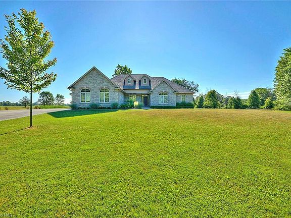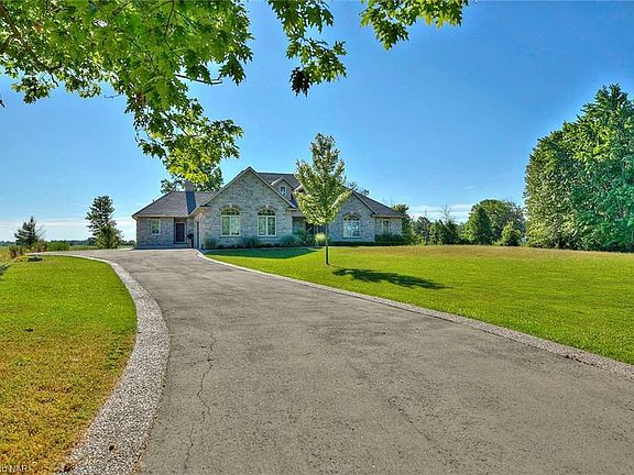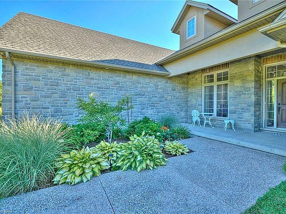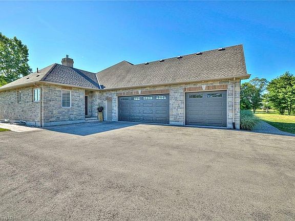 This Beautiful 1.7 acre Estate Home on the prestigious Mill Race across from the Welland river is immaculate, with attention to detail evident the moment you arrive. Two covered patios to enjoy the peaceful surroundings! Nothing to do here, but move in & enjoy this home thanks to the owners meticulous care! Not often do you get natural gas & high speed internet in the country! This 2012 MABO custom built stone home, featured in MABO's On-Line Custom Home Design Gallery is over 3100 sqft above grade boasting 5 spacious bedrooms, 4 full baths (3 ensuites), extensive landscaping, large paved & concrete edged driveway & walkways as well as an oversized 3 car garage. The North end of the home has an in-law/granny suite with it's own entrance, a large bedroom/sitting area overlooking (O/L) the backyard, 4 pc ensuite with heated floors, large closet & linen closet. The open concept family room & kitchen is the perfect informal gathering area with a gas fireplace, breakfast eating area &patio door to the back covered porch. Every counter surface in the home is stone, including the laundry room with a 2nd dishwasher built-in. The kitchen has a gorgeous backsplash, eating island, expansive counter space & pantry! The formal living room has a custom fireplace surround with cathedral ceilings & a wall of glass O/L the back yard with patio doors for access. There is also a formal dining room & hardwood floors throughout the home. The principal suite is spacious with sitting area/bay window, walk-in closet, 5 pc ensuite w/heated floors &huge tiled shower. A guest suite w/ vaulted ceilings & ensuite O/L the front yard. Bonus hot tub hook-up installed. Expansive full bsmt has separate stairs from garage, oversized windows, bath rough-in & high ceilings. Only minutes from the quaint hamlet of Wainfleet, less than 15 min to several surrounding communities of Fonthill, Welland & Port Colborne with beautiful Lake Erie beaches & an easy drive to the QEW.