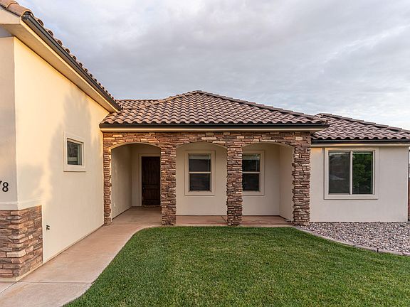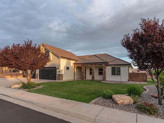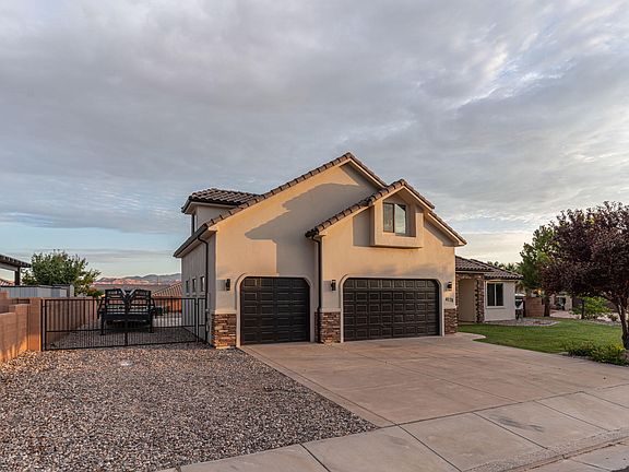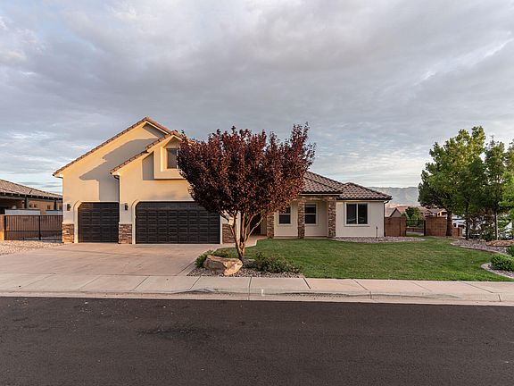 Great home with mature landscaping and fully fenced yard on a premium view corner lot. Includes new upgrades throughout, including new bathroom fixtures and toilets. It has been freshly painted inside and out. Huge RV parking with full hookups. 4 Bedrooms, 3 full bathrooms with 2 family rooms and an extra deep 3 car garage. Outdoor living area with built-in BBQ and pre-plumbed for an outdoor kitchen. Amazing views of Pine Valley Mountain from this elevated lot. Family friendly neighborhood, centrally located to numerous outdoor activities and just minutes from Sand Hollow State Park. The Hot tub is not included with sale. Owner/Agent