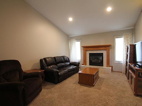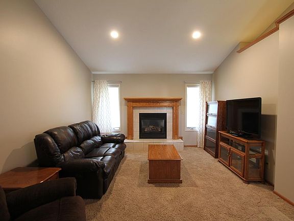Vaulted ceiling & gas fireplace in living room & dining room area, kitchen has oak cabinets. Dishwasher, stove, and microwave stay. Large master bedroom with walk-in closet & double closet. Main floor laundry. Master bath w/ jetted tub & separate shower. Basement will be framed and sheet rocked for family room, bedroom and bath and ready for your finish. Fenced back yard. Sprinklers.