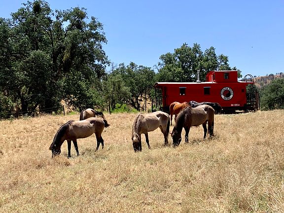 42 Acre Cattle Ranch and Horse Property. From the moment you drive onto this property and see the restored red caboose serving as the address marker you will know you have discovered something very special. You'll pass paddocks and pens for livestock with water readily available. There's a small tack barn with stalls and room to store feed. There are several tortoise hutches near the house. Further down the road is the pole barn and acreage to graze cattle. The home was designed in the graceful style of an Australian Queenslander with a wrap-around porch that's perfect for enjoying cool evenings and peaceful sunrises over the Sierras. Quality craftsmanship is evident from built-in wood shelving and details to the granite counter tops in the kitchen. The upstairs master suite has two walk-in closets and a large ensuite bathroom. You must see the beauty of this location and feel it's tranquility to truly appreciate this hidden gem.