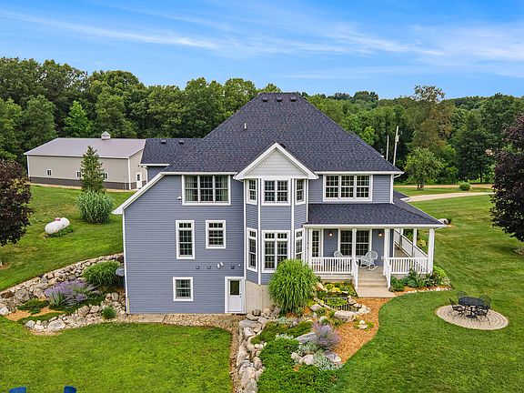 HIGHEST & BEST OFFERS BY 8/13 at NOON! Single owner, custom design, Dave Roberts built impeccably maintained, updated, and perched on 20 acres of gently rolling meadows and mature trees. In 2016 the 40x64 pole barn w/electric was added to this amazing homestead! Located in the popular Plainwell School District! Within minutes of US-131, M-89, shopping and entertainment. From the moment you pull in the drive you'll know your home! The veranda spans nearly 3/4 of the home featuring multiple sitting areas to relax, watch nature, listen to the flowing water of the LOVELY pond made from BEAUTIFUL rocks off the property. THREE floors to explore and more! The large GREAT ROOM will be the center that lets the SOUL of the house shine through and bring the outside in! Featuring a welcoming fireplace, an abundance of windows, an AMAZING KITCHEN and a spacious nook for less formal meals. Direct access to the covered veranda, patio and pond. The lovely formal dining room is spacious w/great ambiance! French doors lead to the delightful turret den/office w/built ins for desk or media. Main floor bedroom is spacious and again the views from the oversized windows are amazing, no neighbors in site. Full main floor bathroom just off the mudroom and to round out the main floor is a laundry room that you won't mind doing laundry in w/sink, cabinetry, countertop and a window with a VIEW. 2nd floor boasts of the the even more delightful turret bedroom with built in shelving, along with the 3rd bedroom, HUGE bonus room which would make a great home office, art studio, playroom with endless possibilities! Family bath has pocket door to shower and stool for privacy during busy mornings. Last but not least FRENCH doors open to the TRANQUIL ensuite offering a personal retreat w/spa like bathroom, walk in closet and can accommodate KING SIZE furniture. The final floor, WALKOUT/DAYLIGHT basement featuring large family room w/space for a pool table, 5th bedroom, 4th full bathroom and great storage space with access to the fire pit area for more informal entertaining. I GAURENTEE your going to FALL in LOVE!