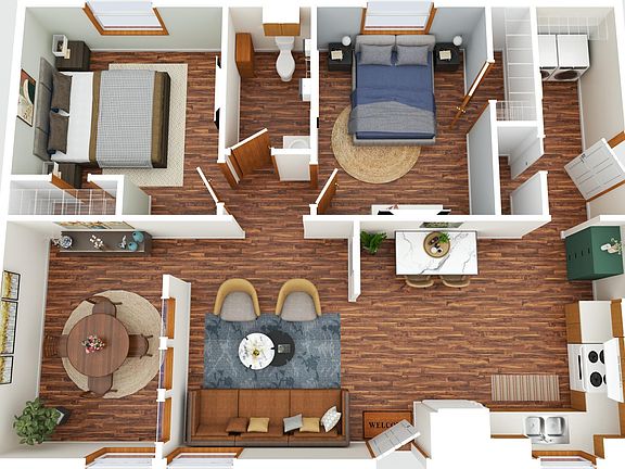 Inside, you’ll find 2 bedrooms plus an office/den (or add a door for a 3rd bedroom). The open kitchen layout provides abundant cabinetry, generous counter space, and room to dine right in the kitchen.
