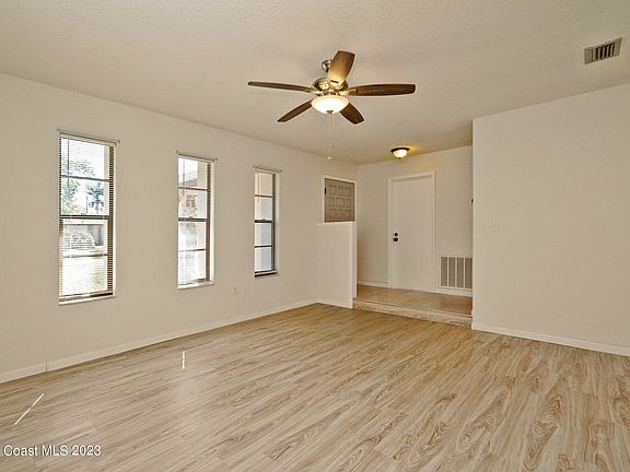 Welcome home! Move-in-ready 3-bedroom, 2-bathroom one-story concrete block home in NE Palm Bay! Open floor plan with 1,314 sq. ft., and brand-new flooring. The kitchen features a breakfast bar and pantry, seamlessly connecting to the dining area for easy entertaining. Large primary suite with a walk-in shower. Enjoy Florida living year-round in the screened patio, overlooking a large backyard with plenty of space for outdoor fun. Close to shopping, dining, and entertainment. On city water and sewage!