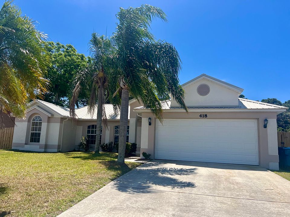 Seller to give $6000 towards Interest rate buydown. No need to wait a year or more to build. This beautiful home on CITY WATER/SEWER is ready now. Some Big ticket items that come with this home are the long lasting Metal Roof, there are easy to install hurricane panels and a large Privacy fenced backyard. These are a Big Savings when added up and when it comes to insuring the property. Your family will appreciate the split floorplan with a Master suite on one side of the home and 2 additional bedrooms with a full bath on the other. The main living area is great for entertaining. It has high ceilings and features a Fantastic kitchen with island, dinette space, a cozy Family Room and extra dining space. The Home is Spotless, ready to move in. No HOA's to worry about. Plenty of Shopping, Eating and Easy interstate access make this a desirable Location. Check this one out today.
