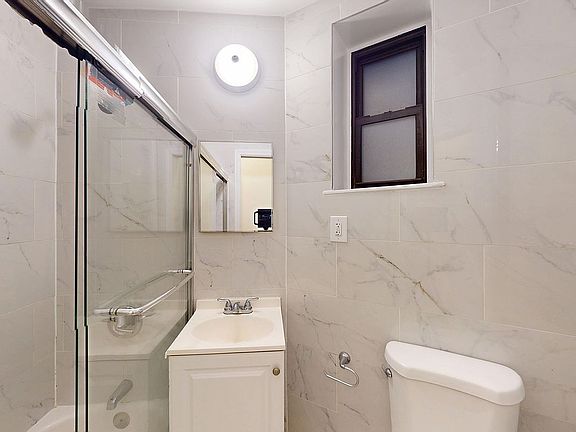 Gut Renovated Bathroom with Spa like finishes, wrap around Carrara marble tiles, shower stall with glass door, and window.