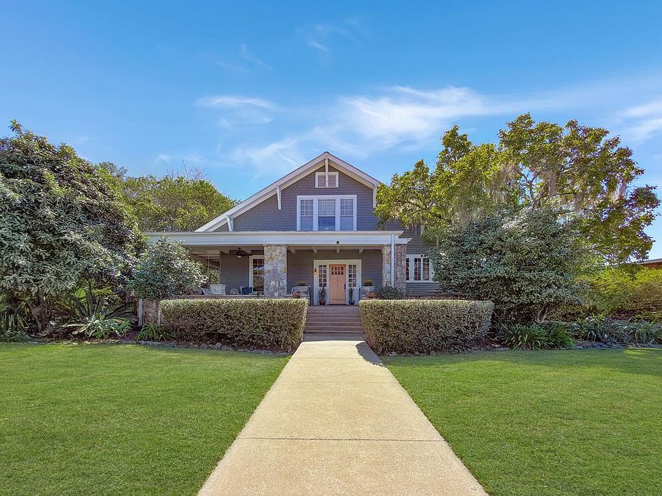 Welcome to The Rock House, a home long admired for its distinctive beauty and timeless presence. Its wide front porch, wrapped in locally sourced river rock, invites you in with warmth and character. This four-bedroom, two-and-a-half-bath treasure blends historic architecture with modern comfort. Every porch swing, coffered ceiling, and pocket door tells a story. From sunrise chats to evening cocktails, the porch sets the tone for a home with soul. Inside, glowing hardwood floors and millwork that would delight any preservationist carry the charm throughout. The front parlor offers an elegant space for guests or quiet moments, while the adjacent living room is filled with natural light and anchored by a cozy fireplace. Each decorative fireplace remains a beautiful focal point, adding character and a sense of history to every room. Coffered ceilings add depth and dimension. The formal dining room, with exposed beams and a decorative fireplace, creates the perfect setting for gathering. Just steps away, the kitchen features brick flooring that adds rich texture and complements the cabinetry and earthy tones, with an eat-in layout ideal for casual meals. A mudroom with a half bath and laundry sits just off the kitchen, and the basement provides extra storage. The main level primary suite includes a charming fireplace, spacious closet room, and private bath. Upstairs, three bedrooms and a wide hallway with a built-in desk and custom bookshelves create a perfect nook for study or creativity. Out back, the screened porch opens to a private yard with mature landscaping, a wired workshop or shed, and plenty of space for pets and play. Located in the heart of downtown Bainbridge, The Rock House is steps from boutique shopping, local dining, and the scenic Flint River. If you've been waiting for a home that blends history, hospitality, and heart, this is it. Call your favorite agent today.