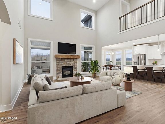 - Description: Inviting great room with 14-foot ceilings, a warm fireplace, and large windows that bring in plenty of natural light and scenic views,Flooring: Carpet