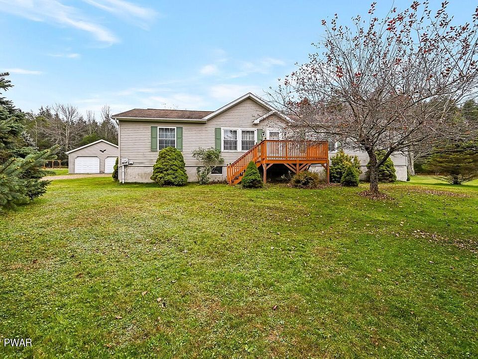 MINT CONDITION, SPRAWLING 3 BEDROOM, 2 BATHROOM RANCH ON 1.22 ACRES! GORGEOUS, PRIVATE SETTING! Located just minutes from Lake Wallenpaupack with easy access to shopping, restaurants & more! Open floor plan with large primary bedroom, attached bathroom and 2 additional large bedrooms. One level living at its finest! Spacious, unfinished lower level is heated & previously used as a woodshop/hobby room. Perfect opportunity to turn this space into a recreation room, family room, or bonus living area. Beautifully landscaped yard with an oversized detached 2 car garage. Move in ready! Make it your own today!
