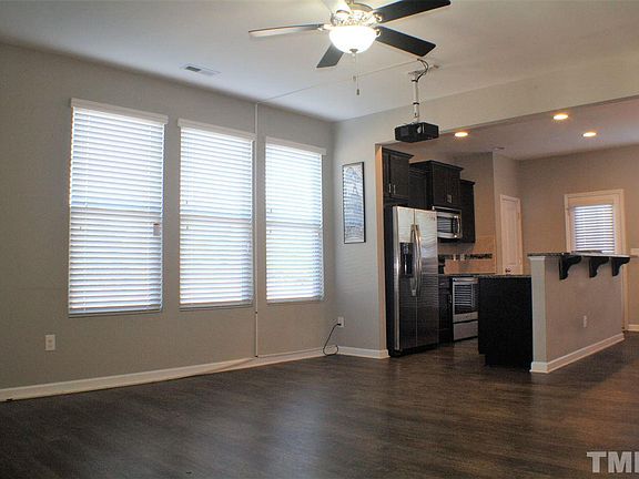Available now! Gorgeous end-unit townhome in convenient Rolesville location w/ fresh paint & 2" blinds throughout! Main level boasts dark flooring & modern wall colors with A/V projection unit (optional). Kitchen has gorgeous granite counters & SS appliances; dining area off of kitchen is great-sized & overlooks back patio/natural area. All three bedrooms are upstairs and have good-sized closets. Mstr is HUGE w/ lots of light, private ensuite & WIC. W/D incl and pets are negotiable. Welcome home!