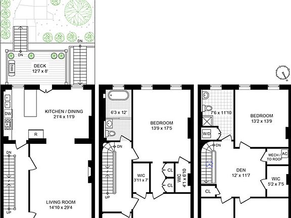 Rare Townhouse Triplex Live life to the fullest in this stunning, detailed, well- renovated, 22-ft-wide brownstone in historic Boerum Hill. This unique triplex offers over 3000 square feet of design-perfect space, seamlessly blending modern enhancements & top-quality renovation with rich, late-1800's elements & Old World craftsmanship. With townhome width & depth rarely seen in this leafy, coveted neighborhood, this standout home beckons with: 4 spacious bedrooms, 2 full baths plus1 half, grandest-scale living room, custom eat-in-kitchen + inviting dining area, den, home offices, & graceful hall galleries & stairwell. Front entry & rear garden plus terrace are also compelling amenities offered by this unique home. The 3-room-depth parlor floor boasts: 13-ft ceilings; sun-filled floor-to-ceiling windows; 2 exceptional marble mantels (1 with wood-burning hearth); paired, museum-quality pier mirrors; exquisite, plaster ceiling medallions; intricately carved crown moldings; plus flowing, original Italianate woodwork & mirrors. A huge, custom-designed, gourmet kitchen, with a host of cobalt-blue lacquer cabinets & granite center island, positively gleams from its top-tier Bosch & Miele appliances, plus dramatic lighting. These culinary bragging points extend into a generous dining area, sized to accommodate a large table & even a couch for those foodie spectators. From here, step out onto the private deck overlooking your bucolic, south-facing garden oasis. While entertaining, you will find the powder room & coat closet on the lower level pampering extras for all. On the second floor of your triplex-plus, a sun-filled master bedroom furnishes a large walk-in closet, hardwood floors, & another marble decorative fireplace. The totally renovated, spa-nurturing, windowed master bath has a large, free-floating-look sink console & a deep, "half-egg" soaking tub. White, green mosaic floor tiling & extra-large, crisp marble wall tiles are other relaxing elements. There is a large, second bedroom on this floor with another antique, decorative fireplace. Additionally, a windowed home office makes this floor suitable for remote working or hobby-indulgence. The top floor of this 3-floor aerie provides 2 ample bedrooms, another home office, bathroom with shower, & your laundry. This fine property is being offered furnished--but can be delivered unfurnished. AC comfort & thermal windows throughout this one-of-a-kind triplex. Your individual climate control is separately zoned. Tenant pays all utilities. No pets. No smoking within the home. Enjoy Boerum Hill's sensational walk-scores; Citi bikes or your own; the many cafes & watering holes for outdoor & indoor dining; boutiques, galleries, services galore, shopping; & easy.
