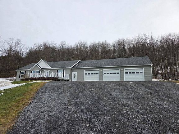 Every detail is taken care of in this 3Br 2BA Ranch overlooking the mountains. OPEN Kitchen, Dining, Living room floor plan. Custom butcher block top to large center island with tons of drawer space for the big pots and pans. The primary bedroom boasts a grand shower with plenty of closet space. The garage is a dream: fits THREE vehicles, has it's own electric, has built in shelves for your perfect workspace. Choose your heating system: furnace or electric mini-splits with AC in the summers, and best heating for your needs. The dry basement is ready to finish with high ceilings and insulated concrete walls. The water system has a filter and UV lights so there is never any worry about water quality. All the work has been done, so you can sit on the front deck and watch the beautiful sunsets over the mountains. All while minutes from Cooperstown.