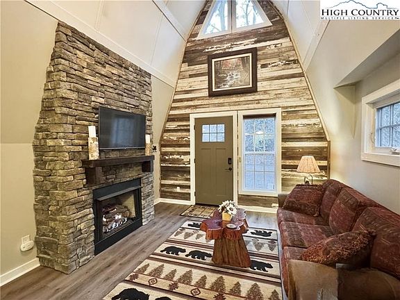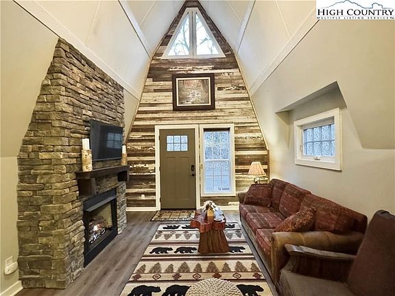 A rare opportunity to acquire one of the chalets in Roaring River, a private gated community. Beautifully updated Blowing Rock riverfront chalet, offered fully furnished and ready to move in! This home offers a unique opportunity with two separate living spaces. The main level features a living room with vaulted ceilings and stone fireplace, open kitchen, primary bedroom and full bathroom, while the upper level consists of a spacious 240 sq ft bedroom loft (not included in total square footage due to the ceiling height). The 598 sq ft lower level of the home is accessed by way of a separate exterior entrance and has a sepaate electric meter. This space includes another primary bedroom, second bedroom, full bathroom, living area and a second full kitchen. Live on one level and rent the other, or spread out and enjoy plenty of room for family and friends! Rentals of one week or longer are allowed. This home has been beautifully updated with luxury vinyl plank flooring throughout, new modern kitchen cabinetry and stylish bathroom updates. Both upper and lower units feature their own private porches overlooking the river. Roaring River Chalets is a gated community, centrally located just a short drive from downtown Blowing Rock and Boone, and minutes from the Blue Ridge Parkway and Appalachian Ski Mountain. Don't miss this opportunity to own a turnkey mountain retreat, fully furnished and ready to enjoy!
