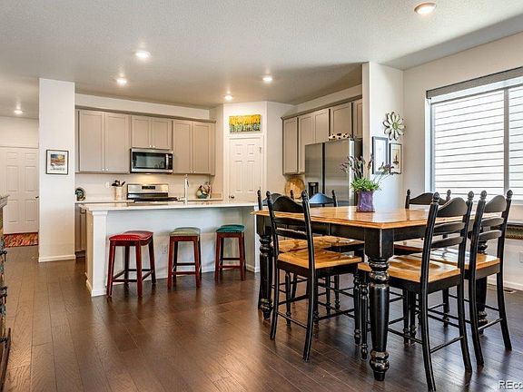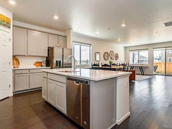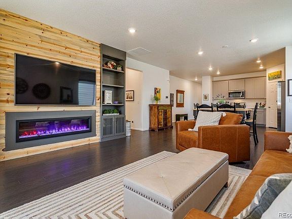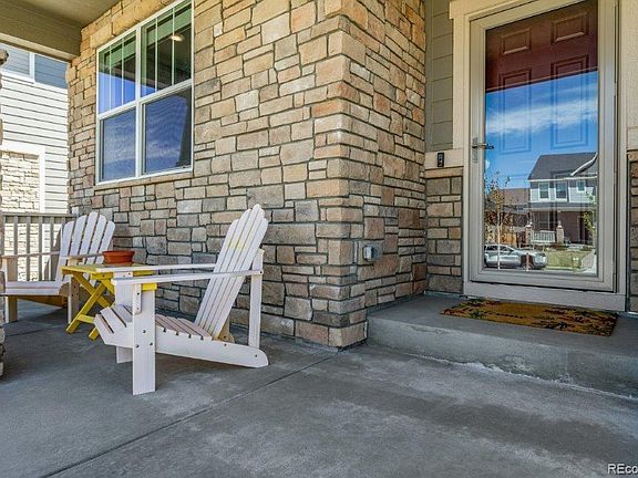 Natural light pours into this home through the many large windows, creating a bright and welcoming feeling. Popular open concept floorplan is ideal for entertaining as well as everyday living. Gorgeous wide plank wood style flooring graces the main living area. 9 foot ceilings, designer blinds, 6 panel doors and canned lighting throughout. Cooking will be a pleasure in the Gourmet's Dream Kitchen which features beautiful Quartz counters & large island with breakfast bar, an abundance of 42 cabinets, stainless steel appliances, including a 5 burner gas cooktop and a pantry. Host your friends in the expansive Dining Room & Great Room area which is complemented by a wood accent wall, built-in shelving with cabinet and an electric fireplace. Sliding glass door opens to the covered back patio. Primary Bedroom Suite has a lovely bathroom with dual sink vanity, chrome fixtures, 18 x 18 tile flooring, huge walk-in closet & oversized linen closet. 2 additional bedrooms are nicely accommodated by a full bath. Home office has an attractive accent wall and a large window overlooking the front porch & yard. Space is ideal for remote working. Extensive future living space in the 1,807 square foot unfinished basement. Features 3 egress windows, rough-in plumbing & high ceilings. This summer you will enjoy your covered back patio and the low-maintenance xeriscaped backyard which includes several plantings with drip lines, a flagstone path and a fully fenced yard. East Creek community is conveniently located minutes from E470 & I-225. Easy access to Downtown Denver, close proximity to excellent dining and shopping. East Creek has a neighborhood park and walkways.
