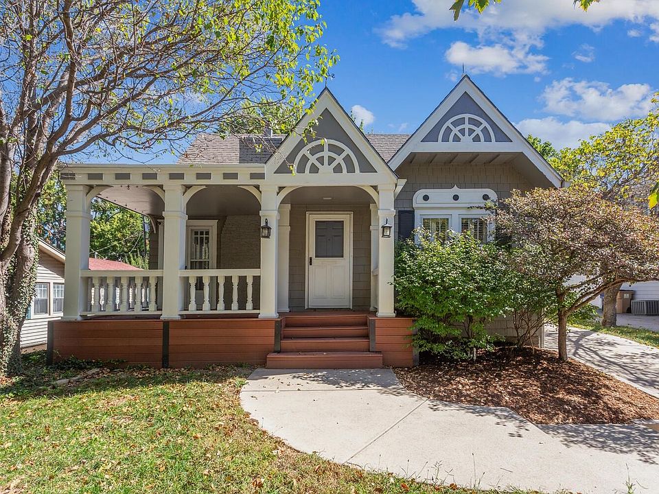 This bungalow is full of charm. Kitchen eating bar opens to the beamed ceiling living room . Bedroom off the kitchen also has beamed ceiling. Living room is spacious and inviting as you enter in thru the foyer. 2 main floor bedrooms and 2 upstairs bedrooms. The master and master bath are beautiful, the flooring, the tile, the balcony via french doors. This is a real neighborhood with a vintage feel but full of amenities. Fireplace is cosmetic only. Listing agent is related to seller.